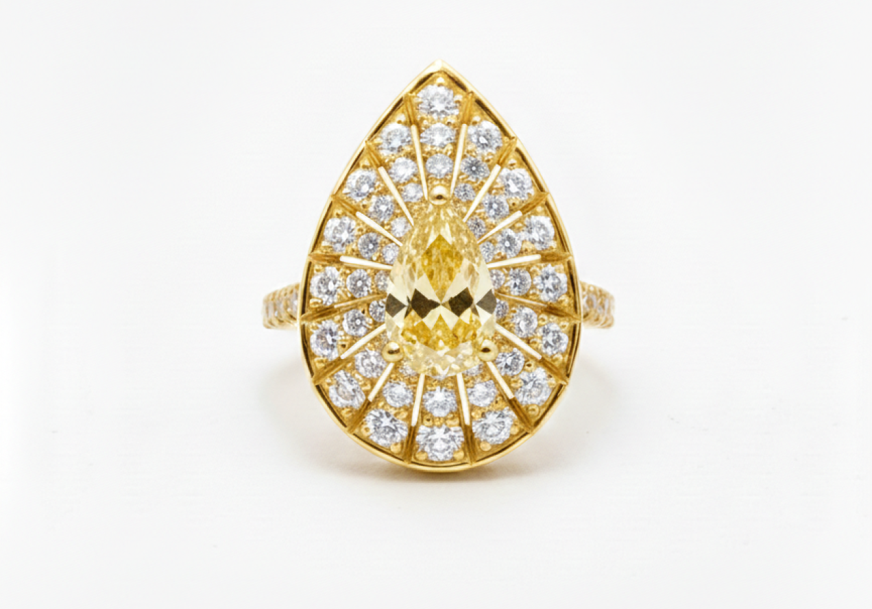 This exquisite creation from DÉMAR’s SUNRISE collection captures the brilliant radiance of the morning sun. At its heart lies a superior GIA-certified pear-cut Fancy Yellow diamond, celebrated for its natural, vibrant hue. The mesmerizing centerpiece is encircled by 103 meticulously set round diamonds, radiating outward like sunbeams to accentuate the rare beauty and golden warmth of the centerpiece. • Product Code: • Series: • Article: