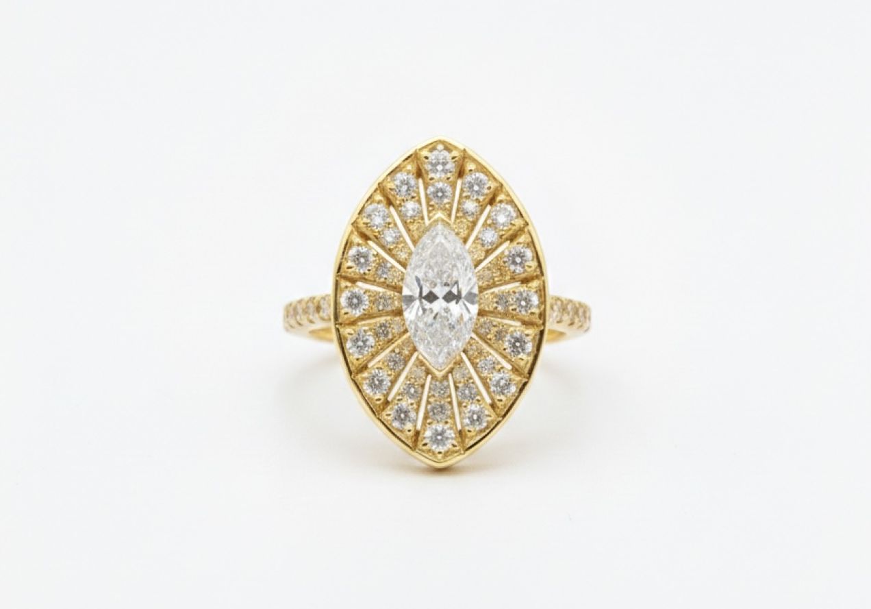 This exquisite creation from DÉMAR’s SUNRISE collection captures the warmth and passion of a rising sun. At its heart lies a superior 0.50ct GIA-certified marquise-cut diamond, celebrated for its exceptional brilliance and high-grade quality. The captivating center stone is encircled by 114 meticulously set round diamonds, radiating outward like beams of light to accentuate the majestic essence of the piece. • Product Code: • Series: • Article: