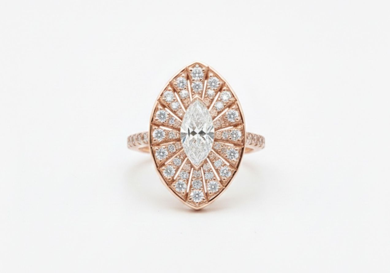 This exquisite creation from DÉMAR’s SUNRISE collection captures the warmth and passion of a rising sun. At its heart lies a superior 0.50ct GIA-certified marquise-cut diamond, celebrated for its exceptional brilliance and high-grade quality. The captivating center stone is encircled by 114 meticulously set round diamonds, radiating outward like beams of light to accentuate the majestic essence of the piece. • Product Code: • Series: • Article: